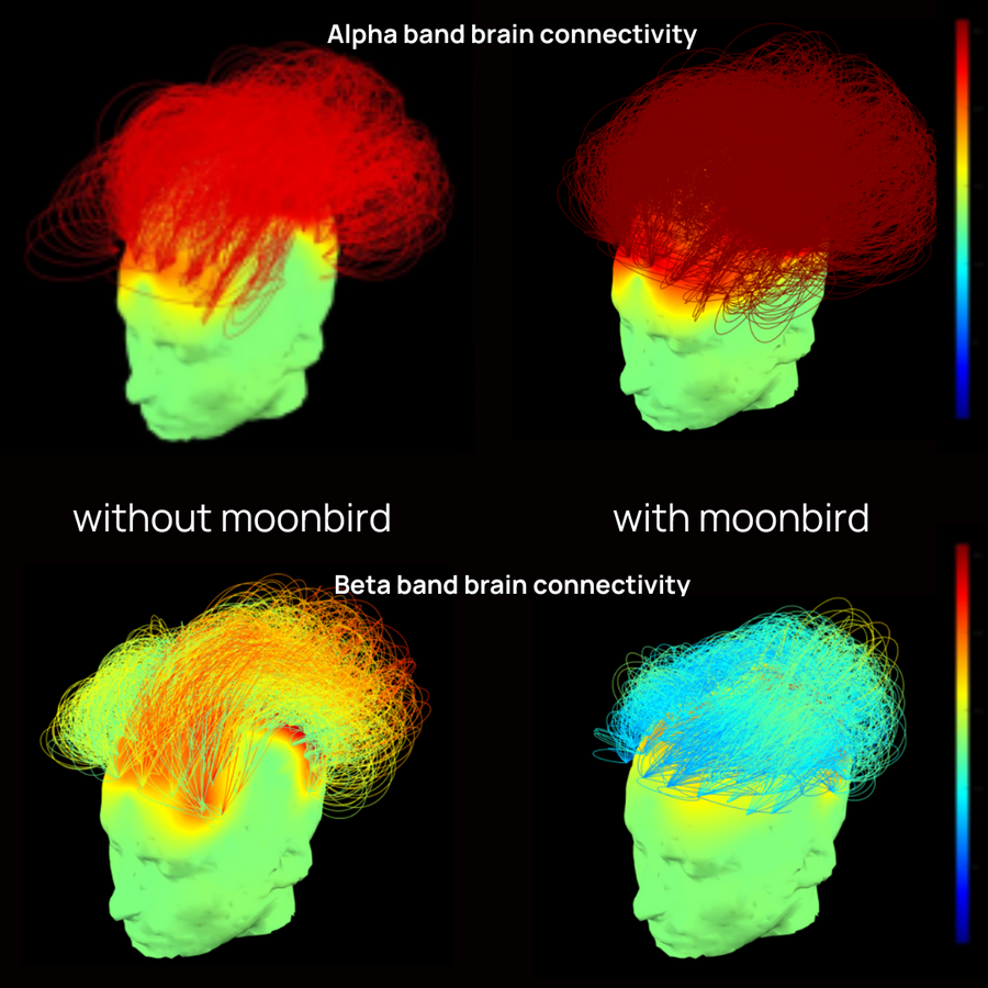 "We recorded brain activity at rest using high-density EEG with and without moonbird. With moonbird, we observed higher alpha-band connectivity and lower beta-band connectivity. These findings indicate that you step away from problem-solving, entering a wakeful relaxed state of mind."